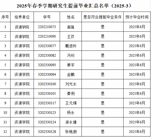 根据学校的相关通知要求,经研究生个人申请,威廉希尔 初审,威廉希尔 2023级硕士研究生(不含硕博连读、提前攻博研究生)、2022级博士研究生(不含直博生)、2020级直博生申请提前毕业名单如下,如有异议,请公示期内书面反馈意见至研究生科(联系人:周老师,办公室:主楼336,电话:67883627),公示期即日起至2025年3月2日。