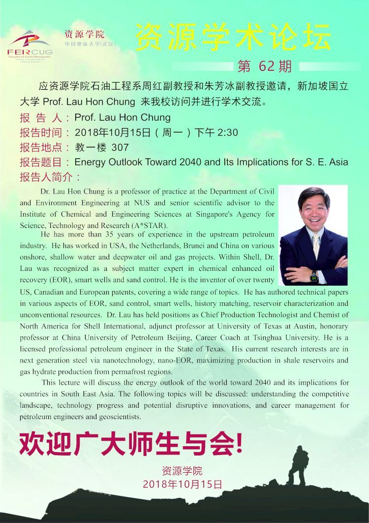 【10月15日】第62期资源学术论坛:Prof. Lau Hon Chung学术报告