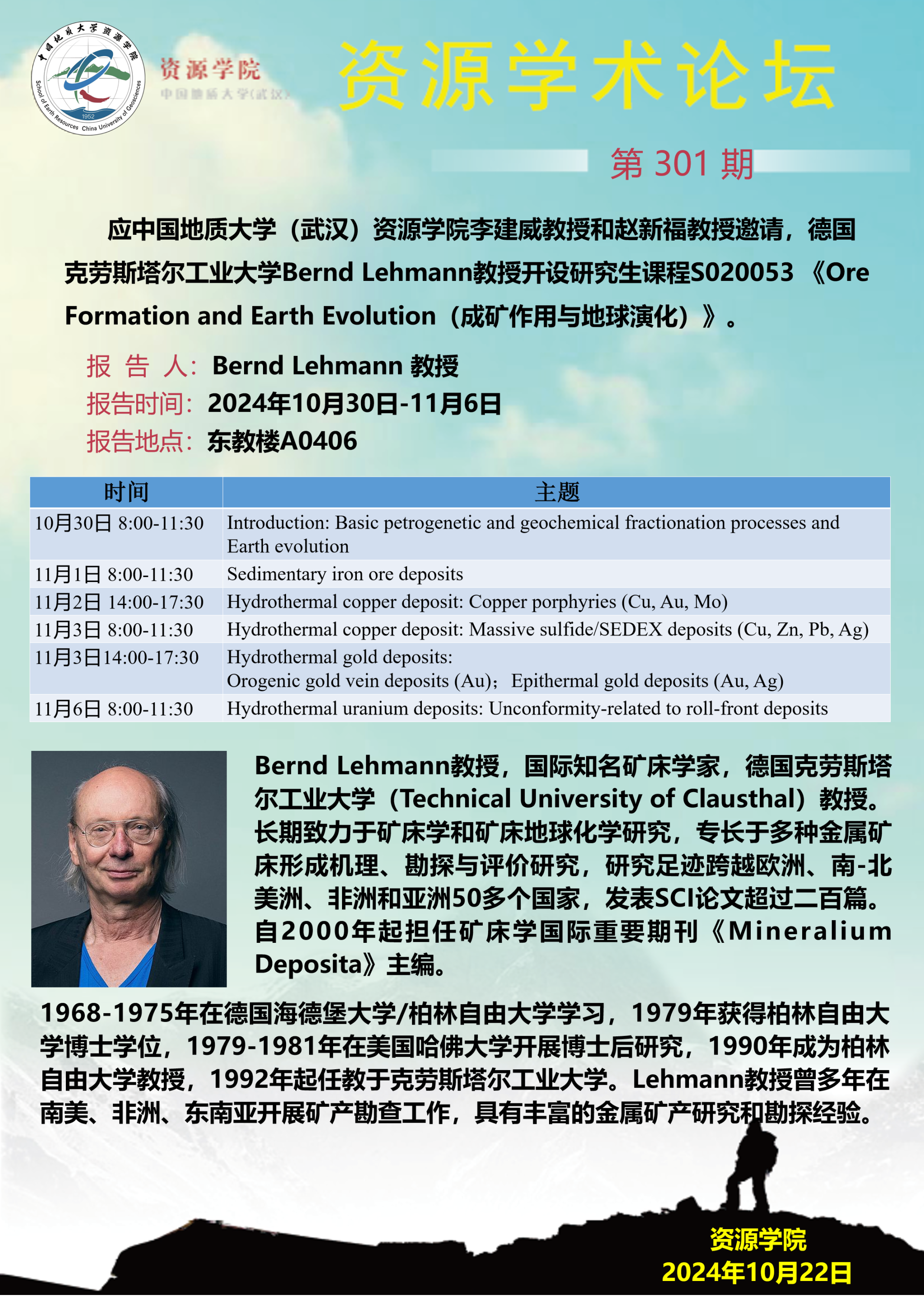 【10月30日-11月6日】第301期资源学术论坛:Ore Formation and Earth Evolution(成矿作用与地球演化)