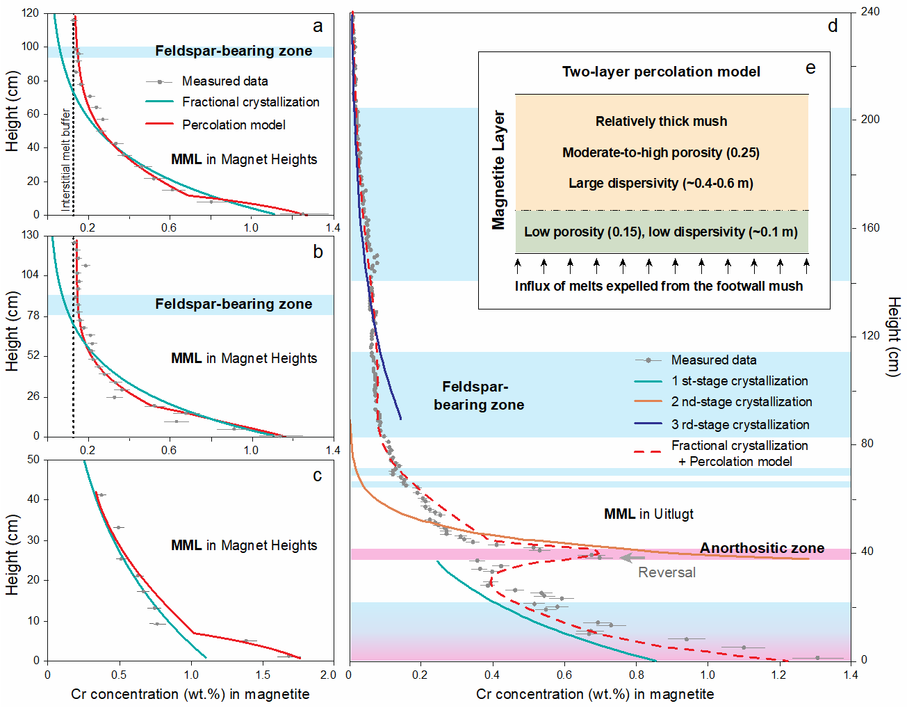 图5磁铁矿晶粥中熔体的渗滤过程对Cr含量的改造作用,图d显示了熔体渗滤对三期岩浆注入形成的晶粥层的改造能够很好地解释剖面中Cr含量的显著反转
