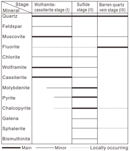 (1)Hermyingyi是一处典型的石英脉型W-Sn矿床,矿脉主要赋存于晚白垩世二长花岗岩中。根据野外穿插关系和镜下矿物共生组合以及矿物结构的详细观察,将成矿作用过程划分为三个阶段:黑钨矿-锡石阶段(阶段)、硫化物阶段(阶段)和无矿石英脉阶段(阶段(图2)。