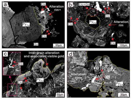 (4)最后,先前形成的含金黄铁矿经历了矿化后的破碎作用,导致黄铁矿局部粉碎。新形成的孔隙促使了黄铁矿颗粒间的流体循环、热液蚀变和不可见金的再活化,这些金以可见银金矿的形式在黄铁矿的孔隙或裂隙中以微小包裹体或大颗粒的形式重新沉淀(图5)。