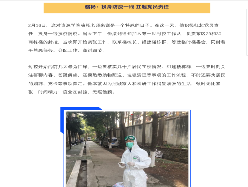 谢丛姣老师带领大家学习疫情防控工作先进事迹,她讲述了支部成员骆杨、吴正彬和任双坡老师在此次疫情防控战斗参与学校疫情防控志愿服务、克服困难做好线上教学工作的事迹。