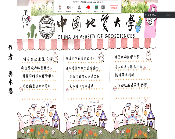在“同心战疫 爱国力行”作品展示环节,老师同学们的一首首诗歌、一幅幅画作展现了大家对中国的深情告白、对战胜疫情的坚定信念以及期盼疫情早日结束的美好心愿。
