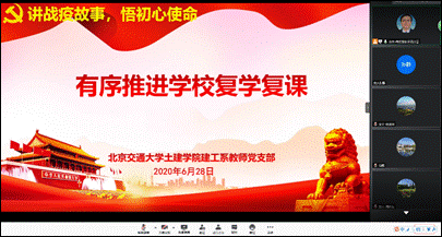 战疫故事,践行初心使命。支部成员围绕疫情防控、网络授课、人才培养、学生就业等主题开展讨论,说身边故事、讲切身体会。我校教师吴正彬作为武汉疫情防控的志愿者,面临严重的疫情形势冲在一线;孙梦迪在疫情期间小孩出生,克服了诸多困难,也感受到来自周围的温暖。北京交通大学土建威廉希尔