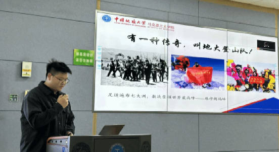 在“红色之声”宣讲环节,中国地质大学(武汉)登山队的传奇故事成为最动人的篇章。宣讲团成员张少龙同志通过图文并茂的形式,带领大家穿越时空:1960年,王富洲校友与队友们协同配合,克服重重困难,从北坡首次登顶珠峰,五星红旗在地球之巅飘扬,不仅书写了人类登山史上的壮举,更彰显了维护国家领土主权的决心;新世纪以来,登山队完成“7+2”极限探险,将科研精神与探险实践结合,在极地科考中展现中国力量。