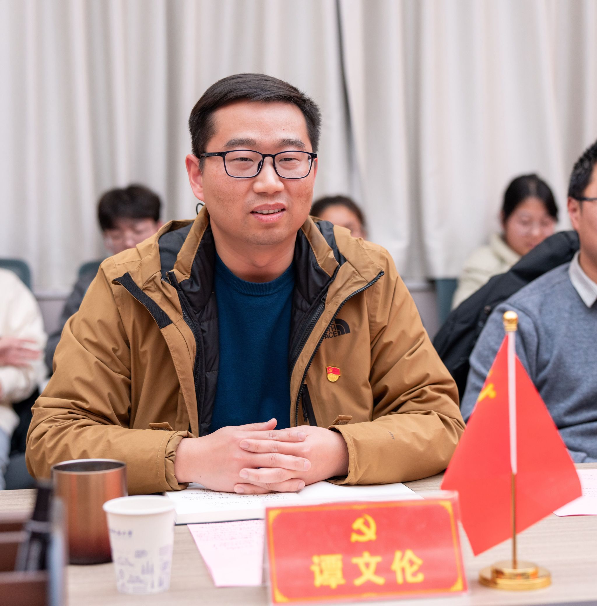 谭文伦为朋辈榜样代表高旭东、符亦飞赠送初心记录本。