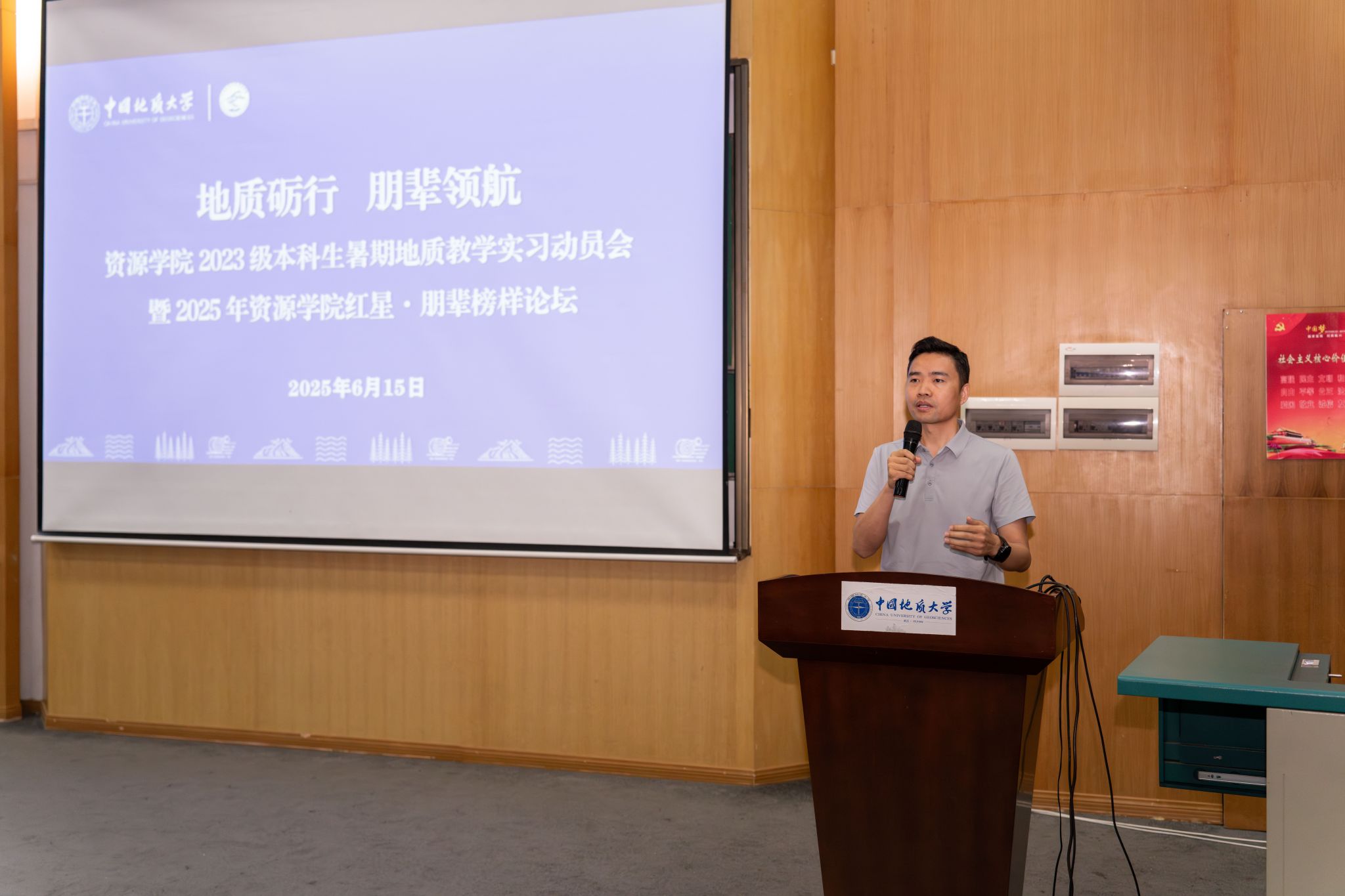 党委副书记谭文伦讲话。他以“知识的进阶”“能力的提升”“价值的涵育”三个关键词对今年暑期地质实习进行明确定位,勉励同学们将专业学习与地域文化相结合,在专业实践中丈量祖国大地,在创作地质诗歌中弘扬地质文化,实现学科知识与文化素养有机结合。他特别强调了“自己是安全的第一责任人”,要严格遵守学校和实习基地的各项规章制度、保密制度,全员购买暑期实习保险,确保安全、高效地完成各项教学任务,真正将课堂所学转化为实践能力,为将来投身资源能源领域发展积蓄力量。