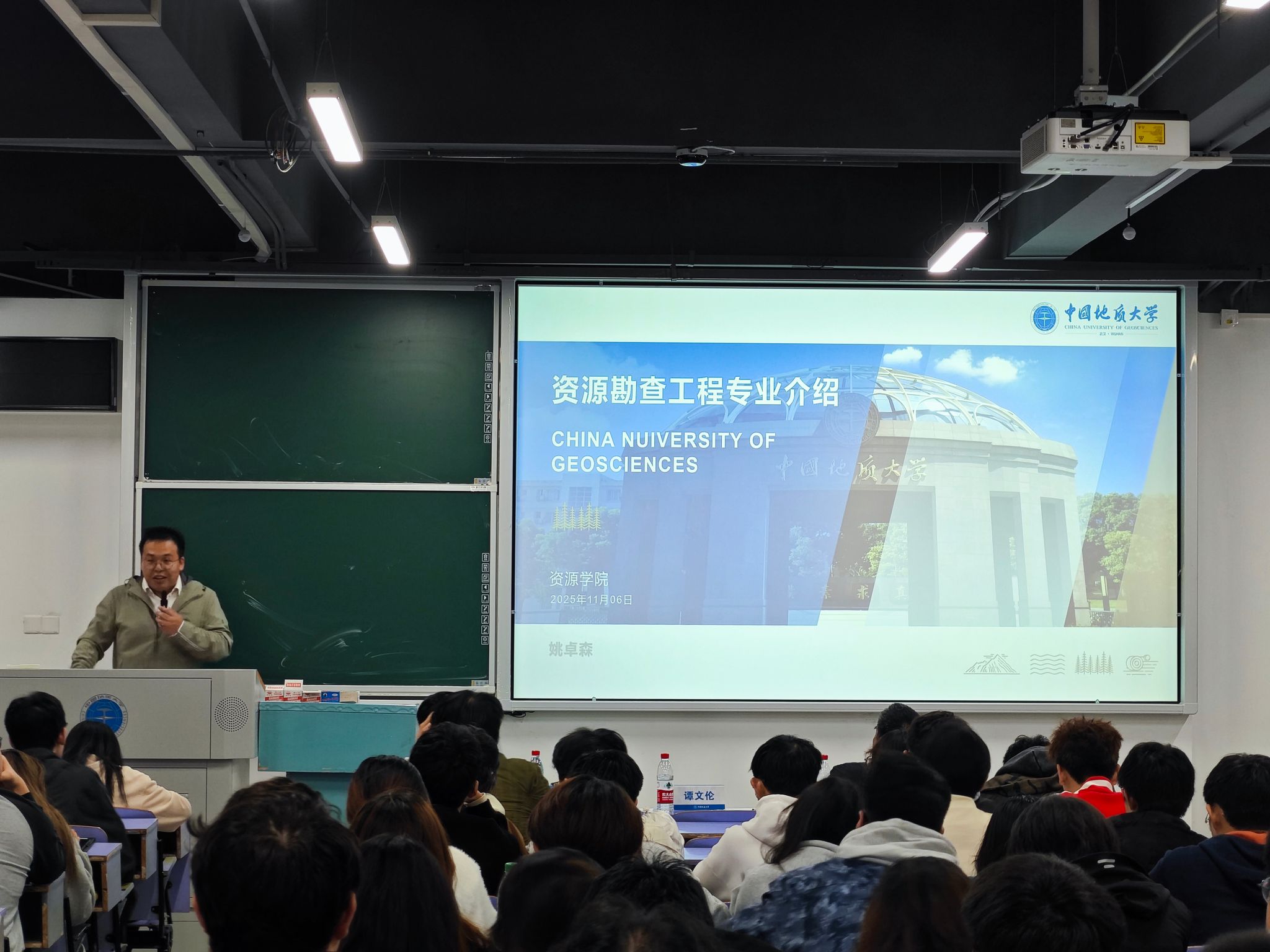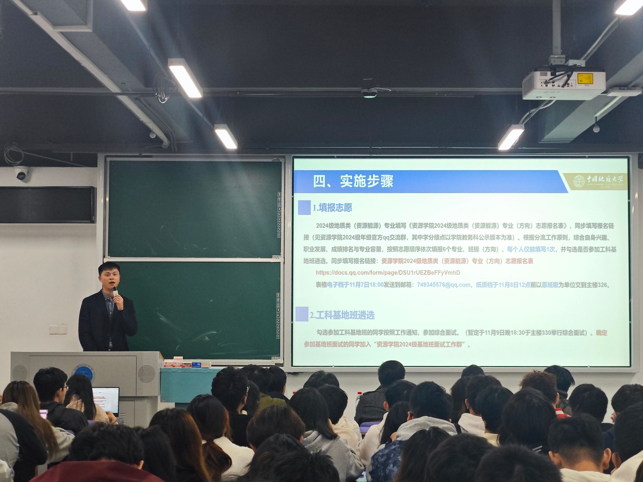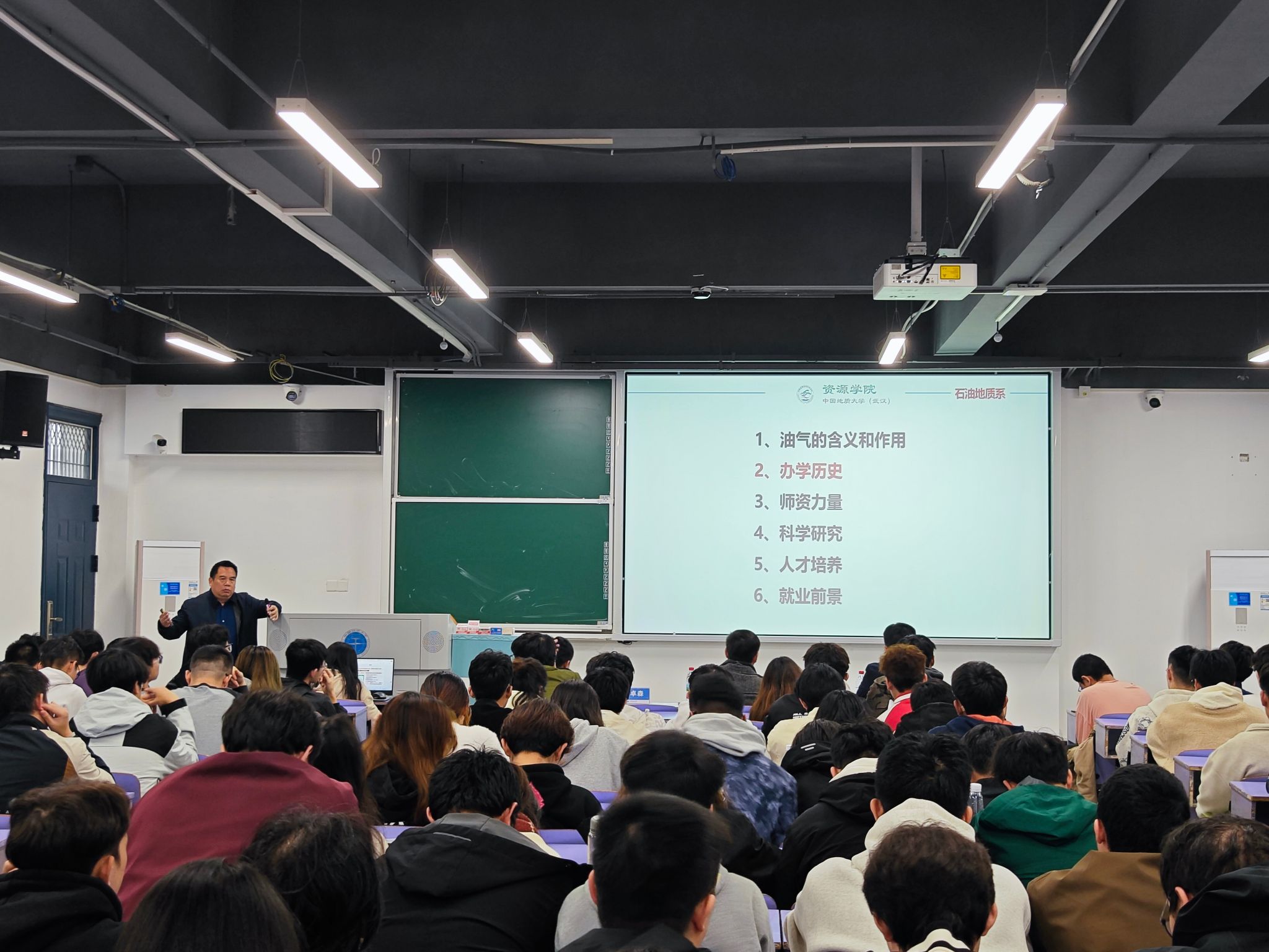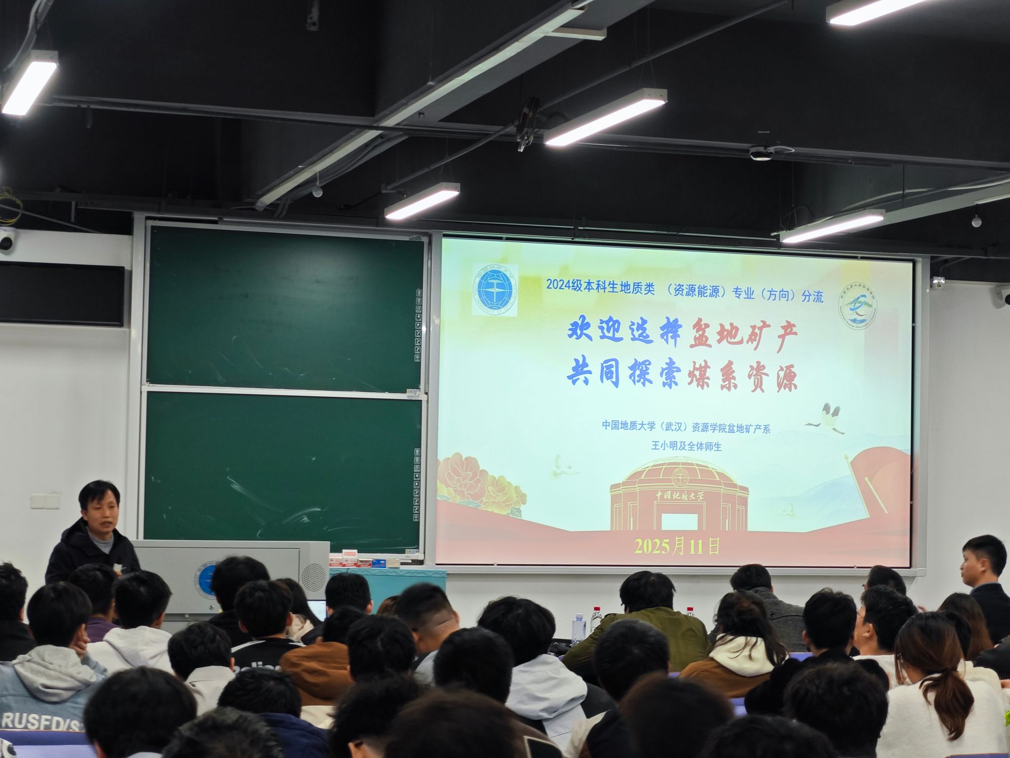 党委副书记谭文伦、石油地质系主任叶加仁、盆地矿产系党支部书记王小明、资源系教师姚卓森,专兼职辅导员及2024级地质类(资源能源)学生参加。2024级辅导员刘睿主持会议。