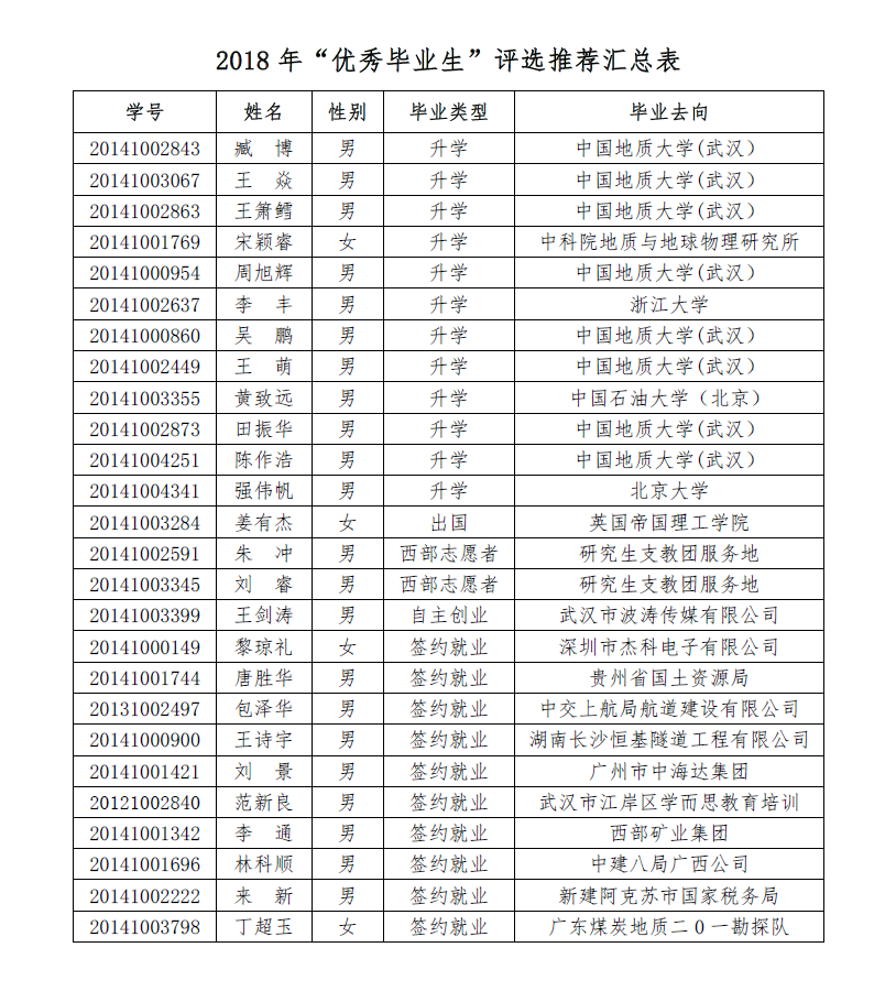 经学生个人申请和威廉希尔 综合评审,现评选出020141、025141等2个班级为2018年先进毕业班,遴选出藏博等26名同学为2018年优秀毕业生,现将名单公示如下: