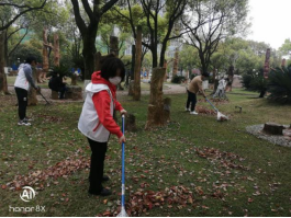 上午8点20分,志愿者们分组集合,领取清扫工具,在校园环卫工人带领下前往相应区域开展清扫活动。扫把挥动间,铺满草地的落叶们抱成了团。在阿姨们的指导下,志愿者们将树叶装上推车,并送至垃圾处理处。