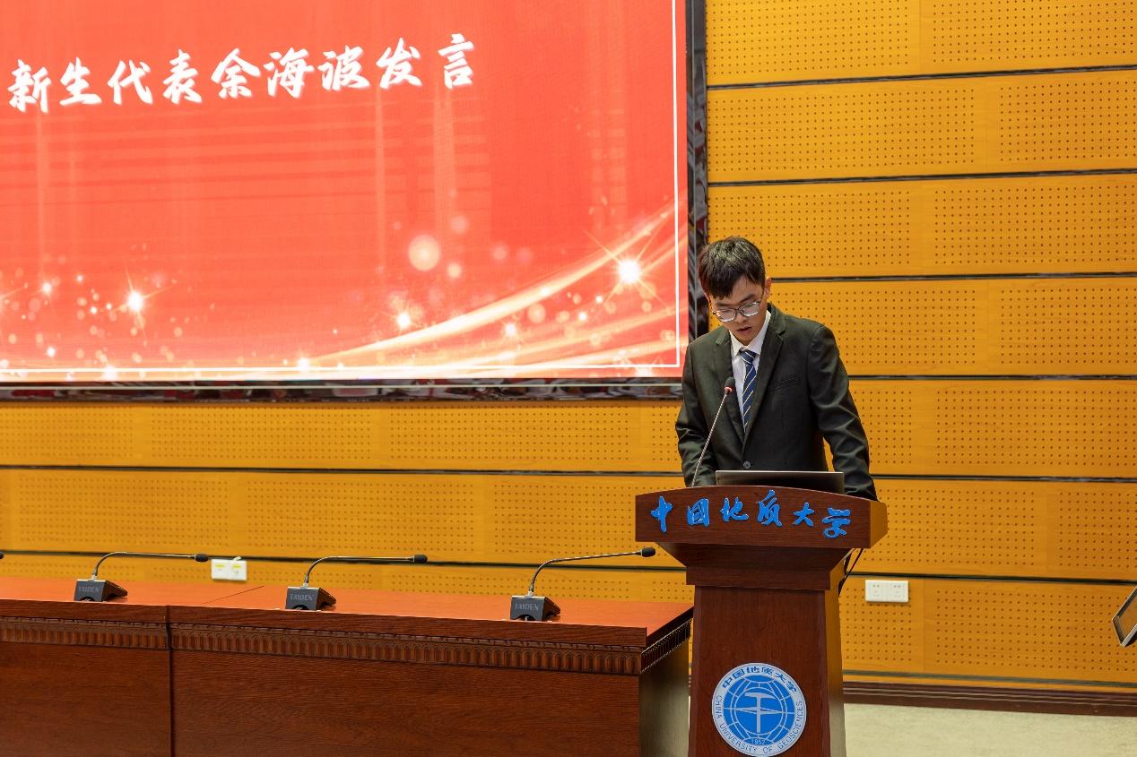 新生代表余海波同学发言。他倡议同学们要继承老一辈地大人、资源人的昂扬斗志,践行“艰苦朴素 求真务实”校训精神,把握好最美青春年华,用不懈努力在威廉希尔