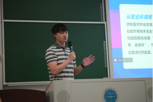 任双坡老师讲到,同学们要跳出思维定式,尽早明确目标,坚定选择道路,靠拼搏奋斗扬起青春风帆。他讲到,同学们要珍惜大学时光,把握锻炼机会,不积极拓展视野,以扎实的专业能力和过硬的综合本领实现职业的成功。