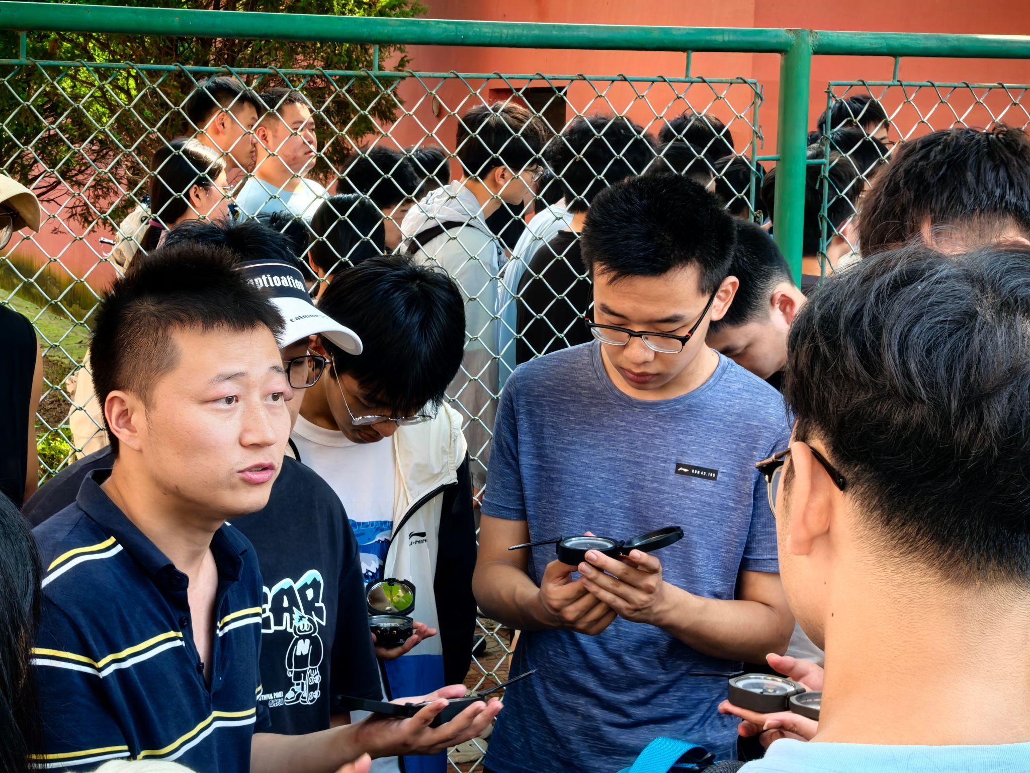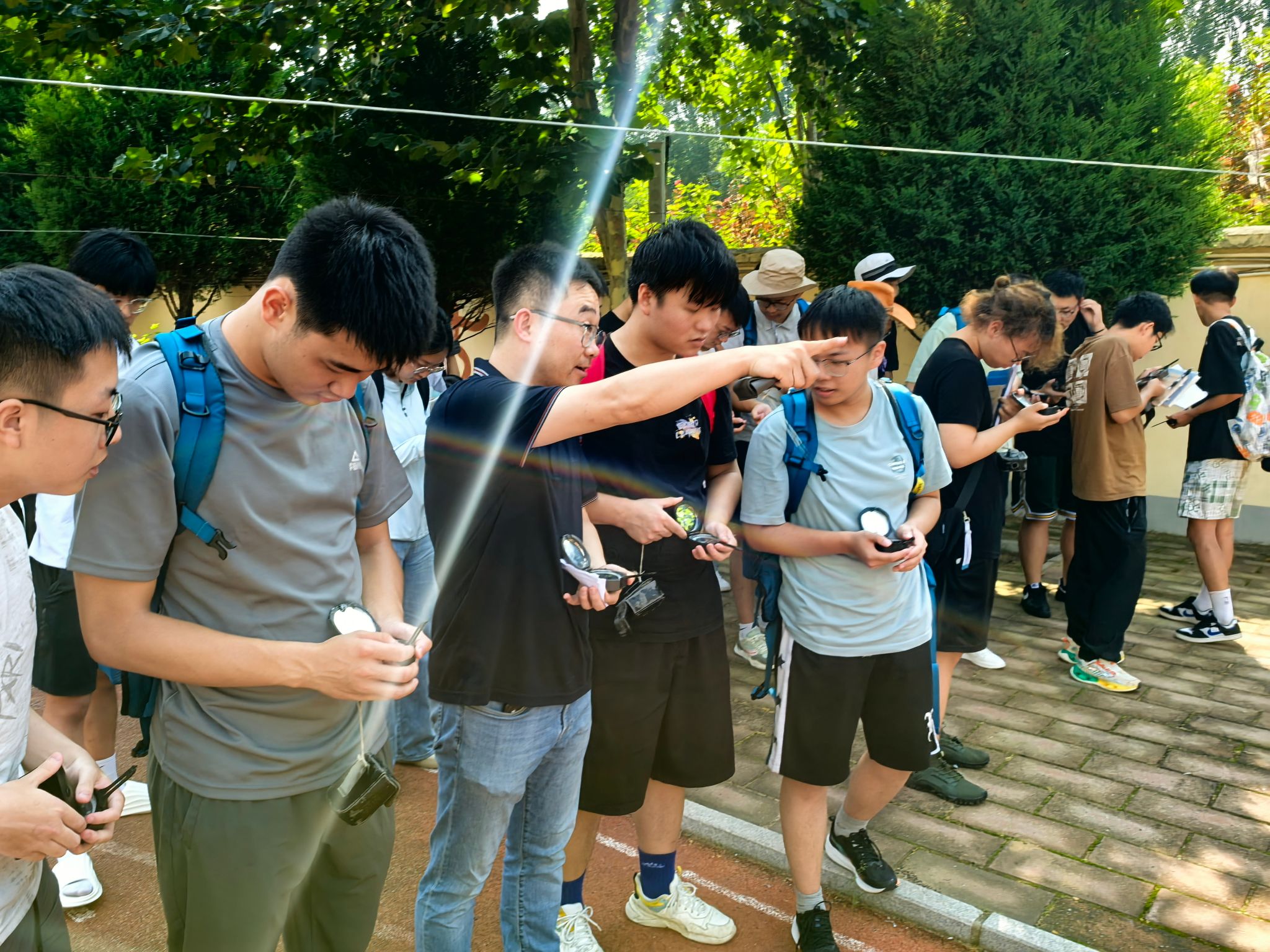 集中教学结束后,由带队老师带领各班级到操场进行分班教学,在老师们的指导下,同学们进行罗盘使用实操训练,调校磁偏角、测产状、测方位……同学们认真聆听、不断尝试,并进行实际操作演示。
