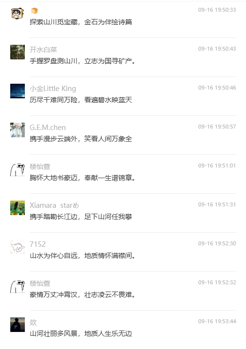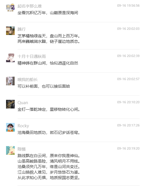 的师生们以实习路线上的自然风貌和专业实践为灵感,创作了超过120首地质主题的诗歌。特别是中秋节前夕,在刘晓峰老师的诗意引领下,一句七言绝句激发了同学们的创作热情,他们迅速将实习中的所见、所学、所感,凝练成一首首充满激情的诗篇,在班级群里接力分享,有的作品甚至在短短几十秒内一气呵成。这些诗歌抒发同学们立志将个人理想融入国家发展大局的报国之情,以及将专业知识转化为服务社会的实际行动的信心。这也是秭归实践教学团队多年来一直打造实践教学文化品牌,将传统文化和地学文化融入野外实践课程,激励和培养同学们艰苦奋斗、实事求是、敢于探索的科学精神,同时让学生欣赏祖国大好河山,感受实习区人文底蕴。
