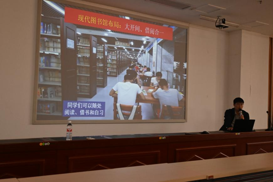 图书档案与文博党委综合服务党支部书记刘安璐从馆舍空间、功能布局、设备使用、规章制度等方面向作了介绍,让大家对学校图书馆馆藏文献资源情况、学习环境、服务内容等有了更加全面的了解。
