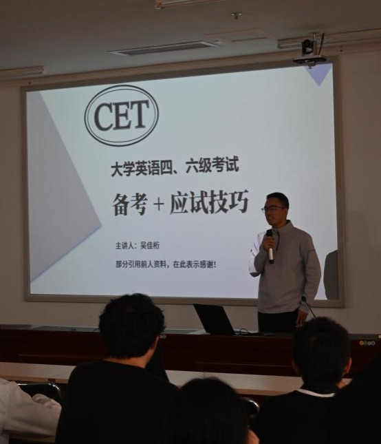 基地班本科生党支部吴佳珩同学为大家分享大学英语四六级考试备考经验。他从听、说、读、写四个角度展开,强调不要用学习英语的方法来备战考试,要持续性学习,阶段性备考,这样才能真正提升到自己的英语能力。此外,他向大家分享了他在备考时使用的软件——英语写作教学与评阅系统,这款软件是一款非常好用的自我写作练习网站,可以帮助同学们快速提升写作技巧。吴佳珩同学还从四六级考试试卷的题型结构角度出发,挑选了部分往年真题,为大家实例讲解不同题型的做题技巧以及做题顺序,让大家对英语四六级备考有了更清晰的思路。