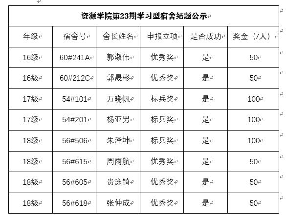 为了进一步加强寝室的优良学风建设,积极响应“学习型宿舍”创建活动。同时也希望通过此次活动能够营造一种文明、团结、奋进的宿舍氛围,将“快乐学习、自主学习”的学习意识在宿舍发扬光大。良好的学习文化是构建“学习型宿舍”的基本要素,在此次活动中我们将致力于改善寝室学习风气,培养好的个人生活习惯,促进宿舍成员的成长与奋进,营造温馨、愉悦的寝室氛围。经审核,以下宿舍结题成功,特此公示。希望结题成功的宿舍继续保持,争取再创辉煌。也希望其他宿舍向这些宿舍学习,争取在下一期活动中结题成功。