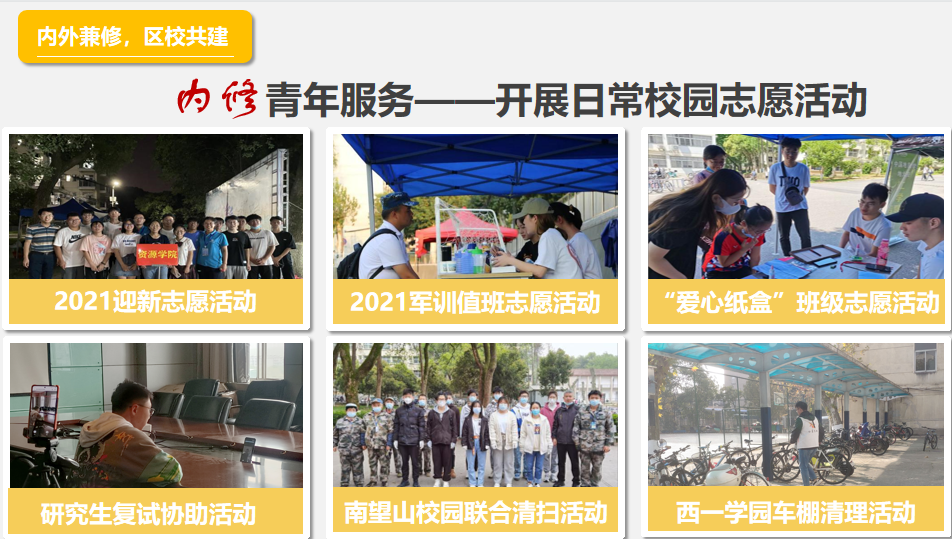 事业发展、学习学风及学术科研建设需要、社会社区需求,弘扬志愿服务文化,开展系列志愿公益活动,打造志愿服务项目、品牌,引导青年大学生在实践中受教育长才干,在奉献中实践人生价值。