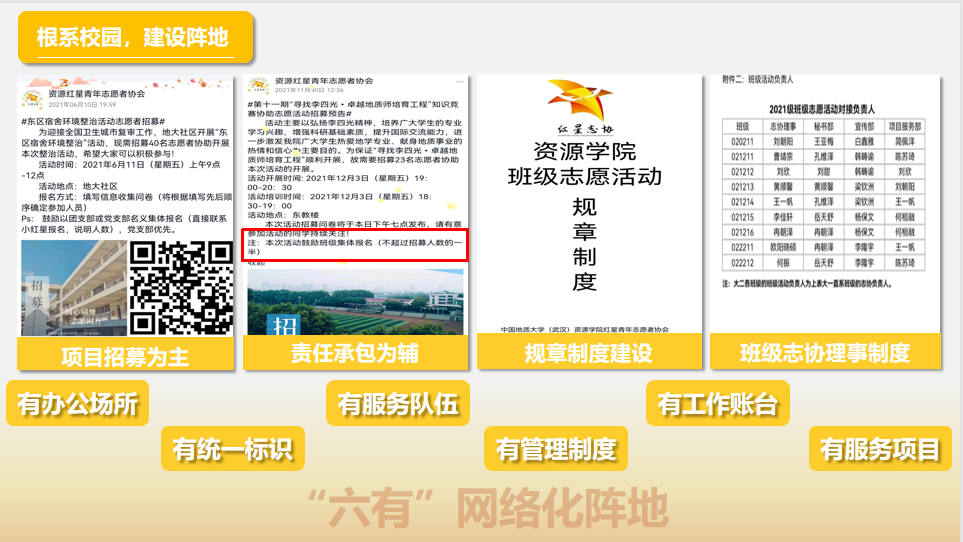 协会在《红星青年志愿者协会章程》指导下,按照有办公场所、有统一标识、有服务队伍、有管理制度、有工作台账、有服务项目“六有”标准搭建活动平台,围绕学校威廉希尔