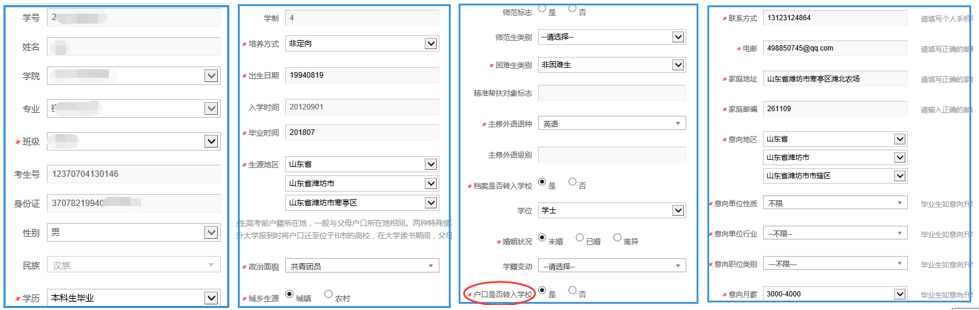 毕业生核对完善毕业生生源信息,包括生源所在地、政治面貌、城乡生源、困难生类别、主修外语语种、主修外语级别、学位、婚姻状况、户口是否转入学校、联系方式、电邮、家庭地址、家庭邮编、意向地区、意向单位性质、意向单位行业、意向职位类别、意向月薪等。