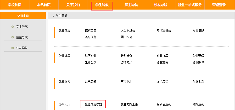 在就业网威廉希尔点击“学生导航”,选择“生源信息核对”。