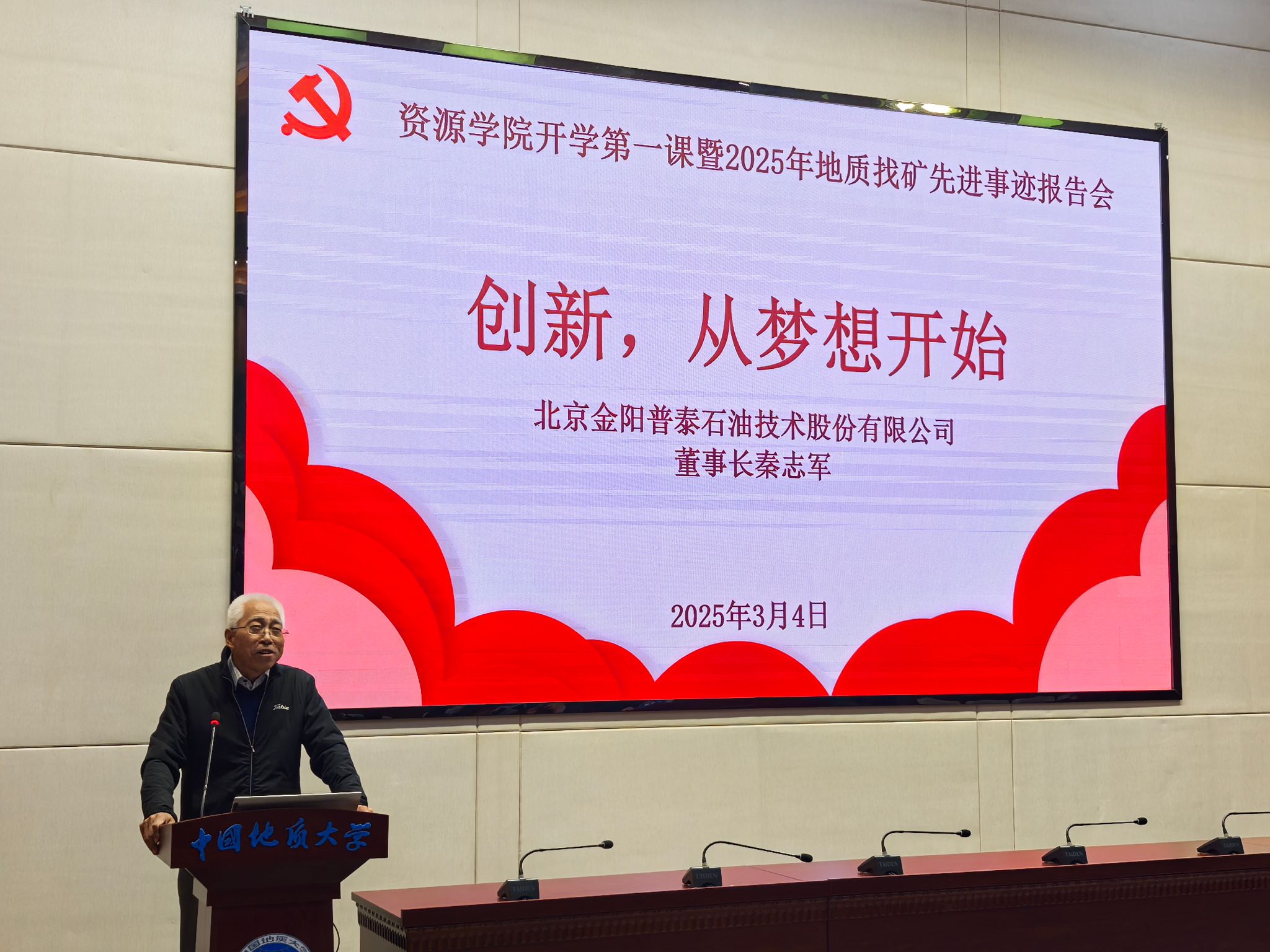 举行“开学第一课暨地质找矿先进事迹报告会”。北京金阳普泰石油技术股份有限公司董事长秦志军、总经理袁钢辉,公司武汉代表胡甫强、王亚婧,学校党委学生工作部部长朱丹,威廉希尔