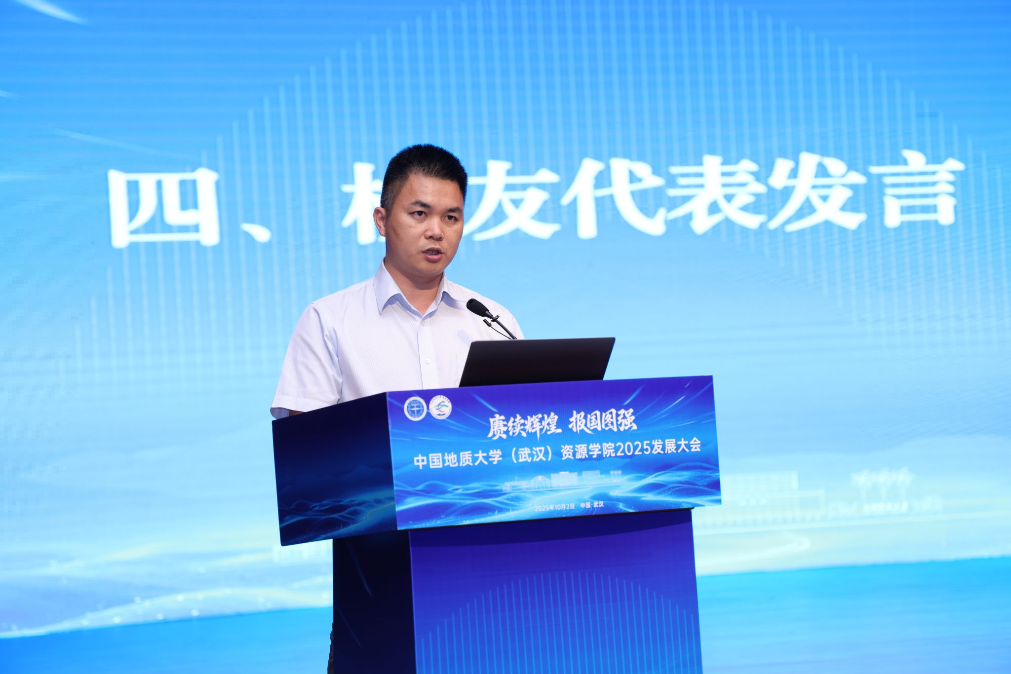 校友代表发言。北京金阳普泰石油技术股份有限公司总经理、2002届校友袁钢辉,紫金矿业集团西北地质矿产勘查有限公司董事长、2008届紫金班校友刘光永代表广大校友发言。他们深情回顾了在校学习的经历,表达了对母校培养的感谢,详细介绍了自身研究领域的工作进展,并祝愿母校继续书写事业发展华章。
