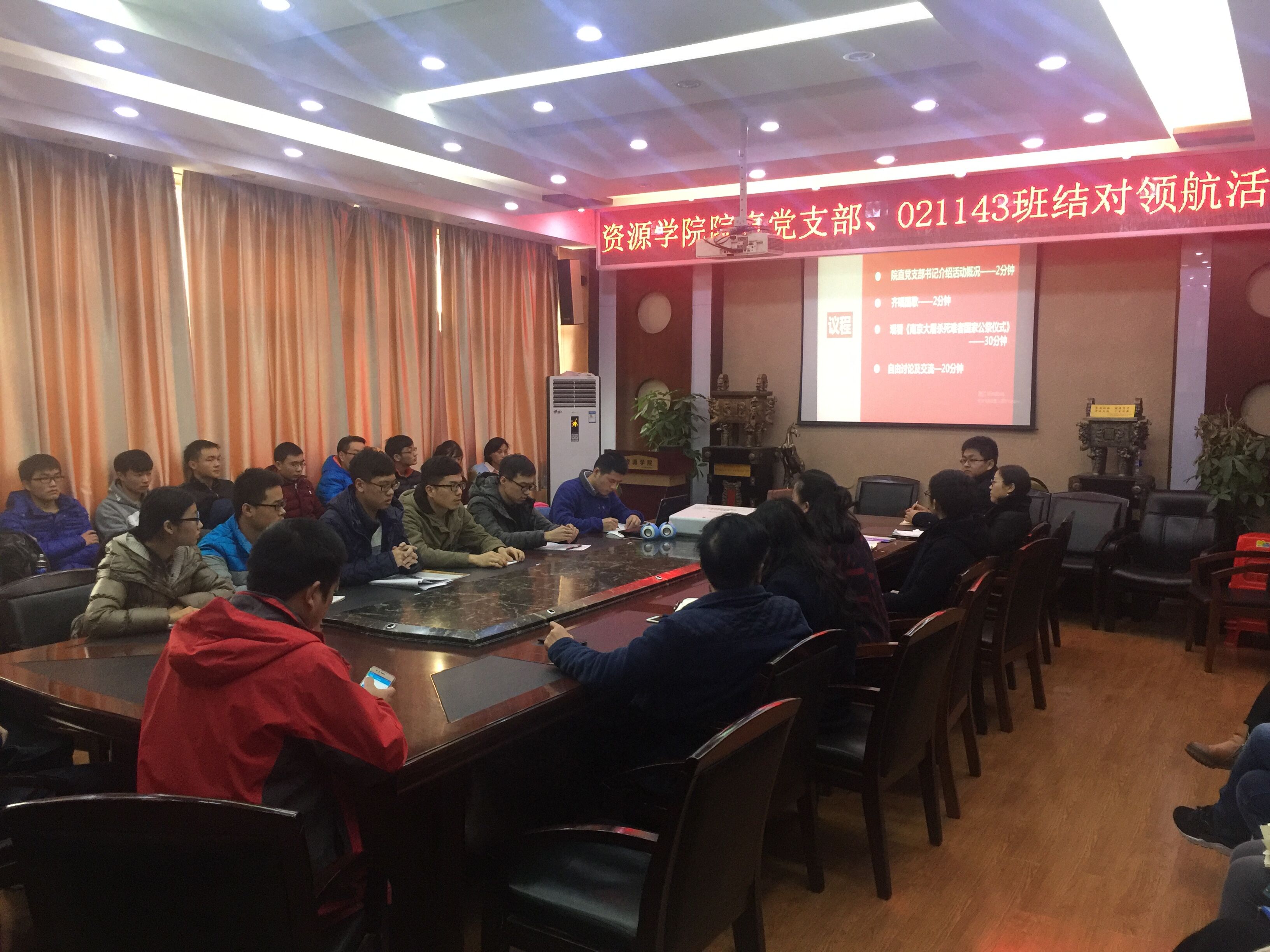院直党支部与021143班在主楼328开展结对领航活动。院直党支部及021143班全体成员参与了此次活动。本次活动以“缅怀英烈惜和平,师生交流促发展”为主题,通过观看视频、学生提问、自由讨论等方式,促进结对单位的相互交流与了解,持续推动结对领航活动。