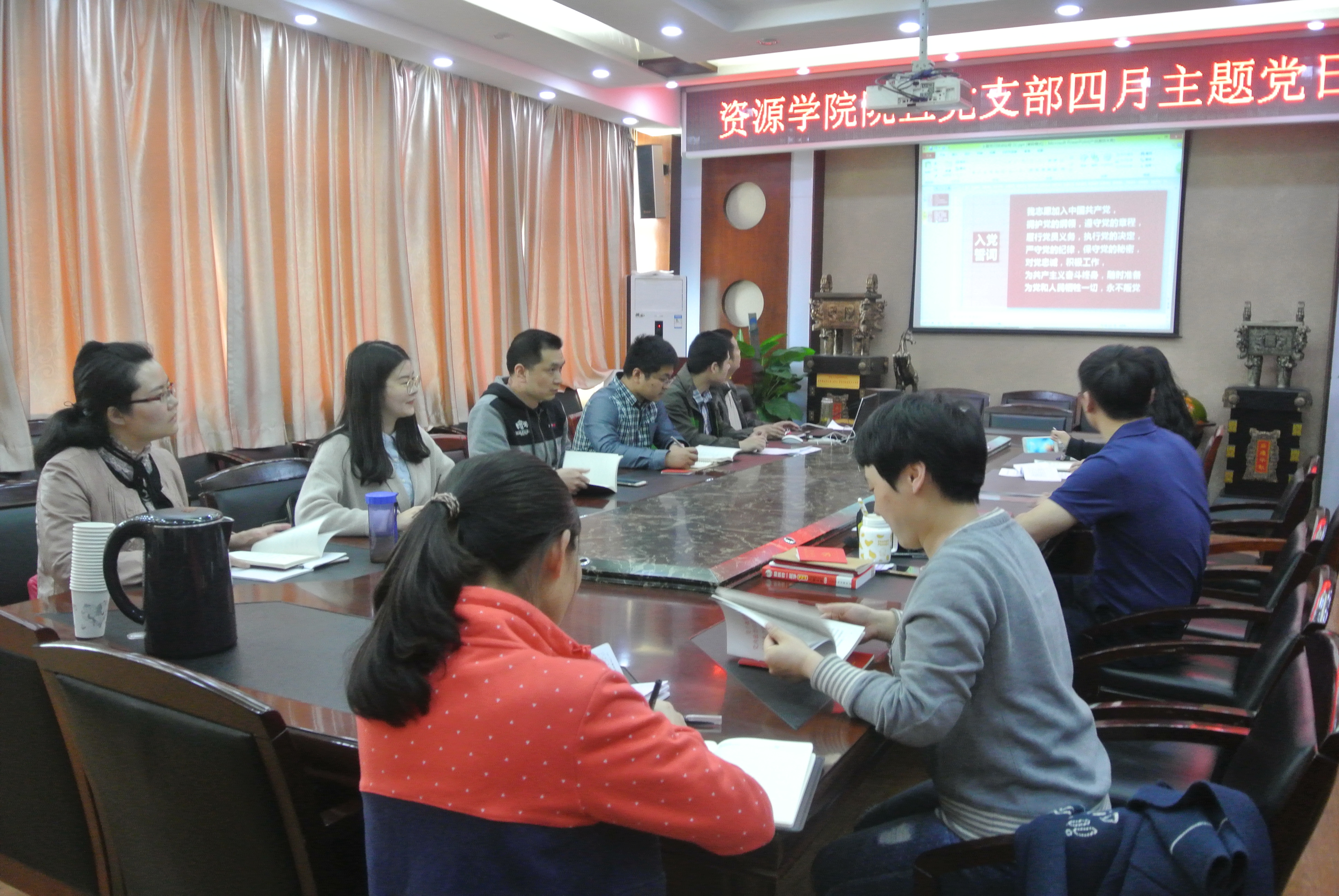 数地所党支部以多媒体宣读形式,深入解读《普通高等学校学生党建工作标准》原文,并根据文件内容进行了讨论。大家一致认为,要严把学生入党质量关,严格政治审查,深入考察发展对象的入党动机是否端正,对党的认识是否深刻,是否懂得党员义务和权利,是否遵守党章党规党纪,是否坚定不移听党话跟党走,确保政治合格。