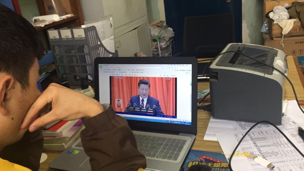 学生党员在办公室观看十九大开幕会
