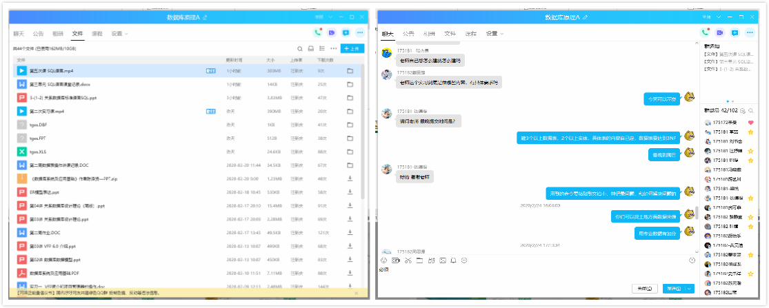 QQ作为一个即时通讯软件是十分强大的,建立QQ群组的方式是整合学生意见、与学生交流沟通的重要途径。在建立的课程群里,每位同学都要将自己的昵称改成学号+姓名,从而防止闲杂人等鱼目混珠。这样做既保证了QQ群里良好的教学秩序,也让有问题的同学能及时和老师对接,反馈的问题也能在群里共享给其他成员。此外不选择微信群而选择QQ群还有一个重要原因就是在QQ群里发送的文件、聊天记录能被上传到云端保存,方便同学随时下载查看,不像微信群的文件和消息记录都会随着缓存删除而消失。