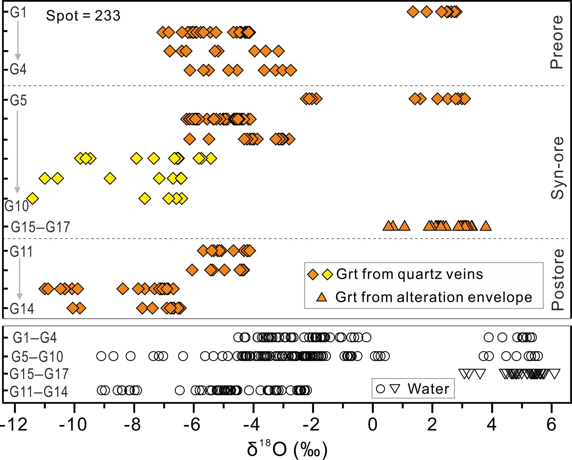 院刊》(PNAS)上发表论文《Garnet secondary ion mass spectrometry oxygen isotopes reveal crucial roles of pulsed magmatic fluid and its mixing with meteoric water in lode gold genesis》,通过石榴石矿物显微结构和氧同位素地球化学研究揭示深部岩浆热液脉动上升及岩浆热液与大气降水混合对脉状金矿床成矿的重要作用。