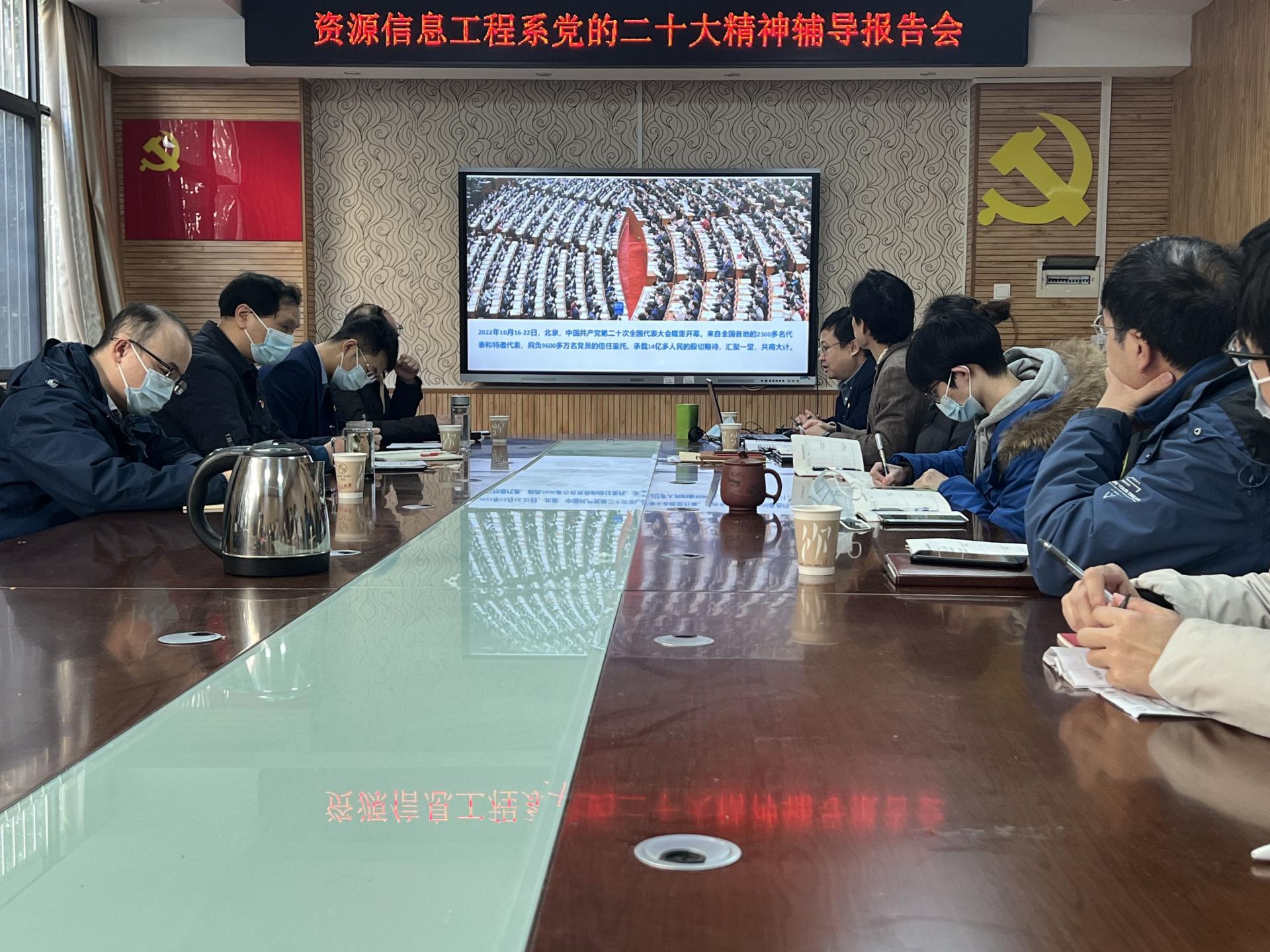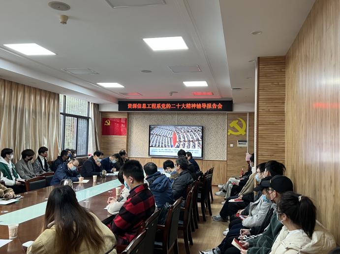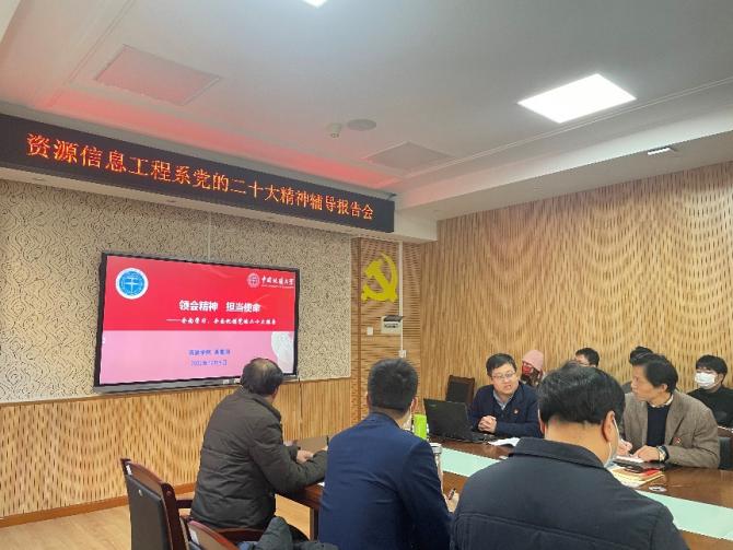 党委书记高复阳给资源信息工程系全体师生党员作党的二十大精神学习专题辅导报告《领会精神 担当使命》,全面解读党的二十大精神,引导党员师生以实际行动深入学习宣传贯彻党的二十大精神,在推进“双一流建设”、落实好立德树人根本任务等方面再创佳绩。