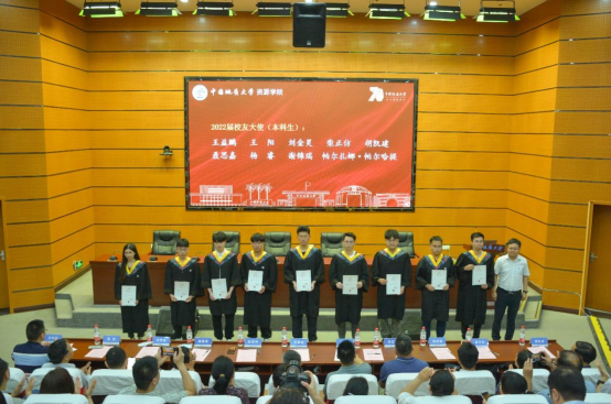 2013届校友、2022年“全国向上向善好青年”入选者欧阳永棚通过线上方式为同学们送上祝福。他深情回忆地大7年求学路,回顾了自己9年间参与朱溪世界最大钨矿床等勘查工作经历,感悟只要能坚持不懈、沉得下心、耐得住寂寞,就能够在平凡的岗位中不断实现自身价值;他谈到地质事业的发展迫切需要有理想、有本领、有担当的青年们加入,希望同学们将个人的理想追求融入党和国家宏伟蓝图中,继续发扬地矿“三光荣、四特别”精神,为保障我国矿产资源安全添砖加瓦,在奋斗中绽放青春之花。