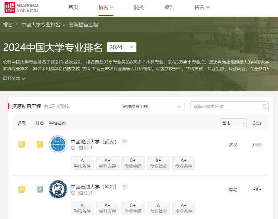 现有资源勘查工程、石油工程、资源环境大数据工程3个本科专业。其中资源勘查工程专业是教育部一类特色专业,首批入选国家一流本科专业,在历年专业排名中均名列全国第一。石油工程专业入选湖北省一流本科专业。资源环境大数据工程专业于2022年获批教育部普通高等学校本科专业备案并于次年招生。