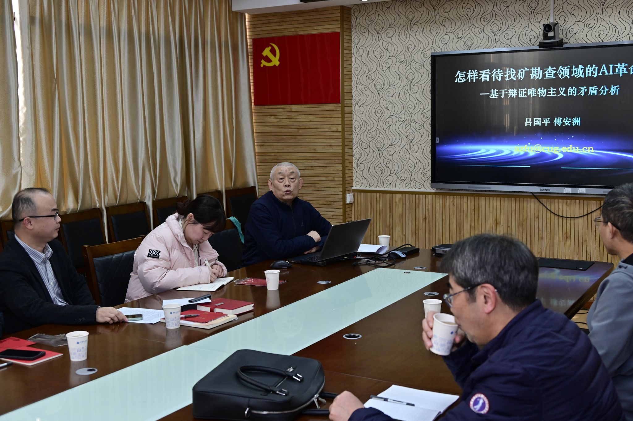 党委书记汪再奇、专任教师夏庆霖、陈建国等以及部分学生,围绕AI新技术与地质勘查深度融合的相关问题展开了深入探讨。