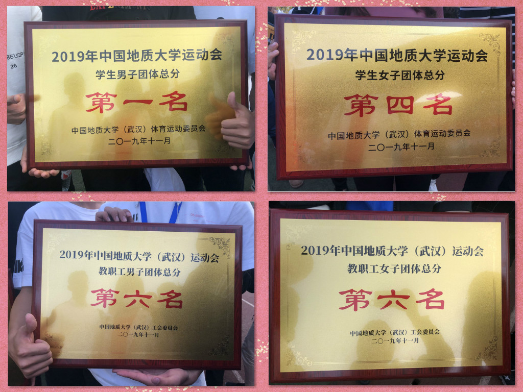 威廉希尔 师生在2019年中国地质大学(武汉)运动会上,求实奋进、勇攀高峰,斩获学生组男子团体第一名、女子团体第四名,教工组男子团体第六名、女子团体第六名的骄人成绩,并获2018年学生群众体育暨体质健康测试先进工作单位二等奖荣誉称号。