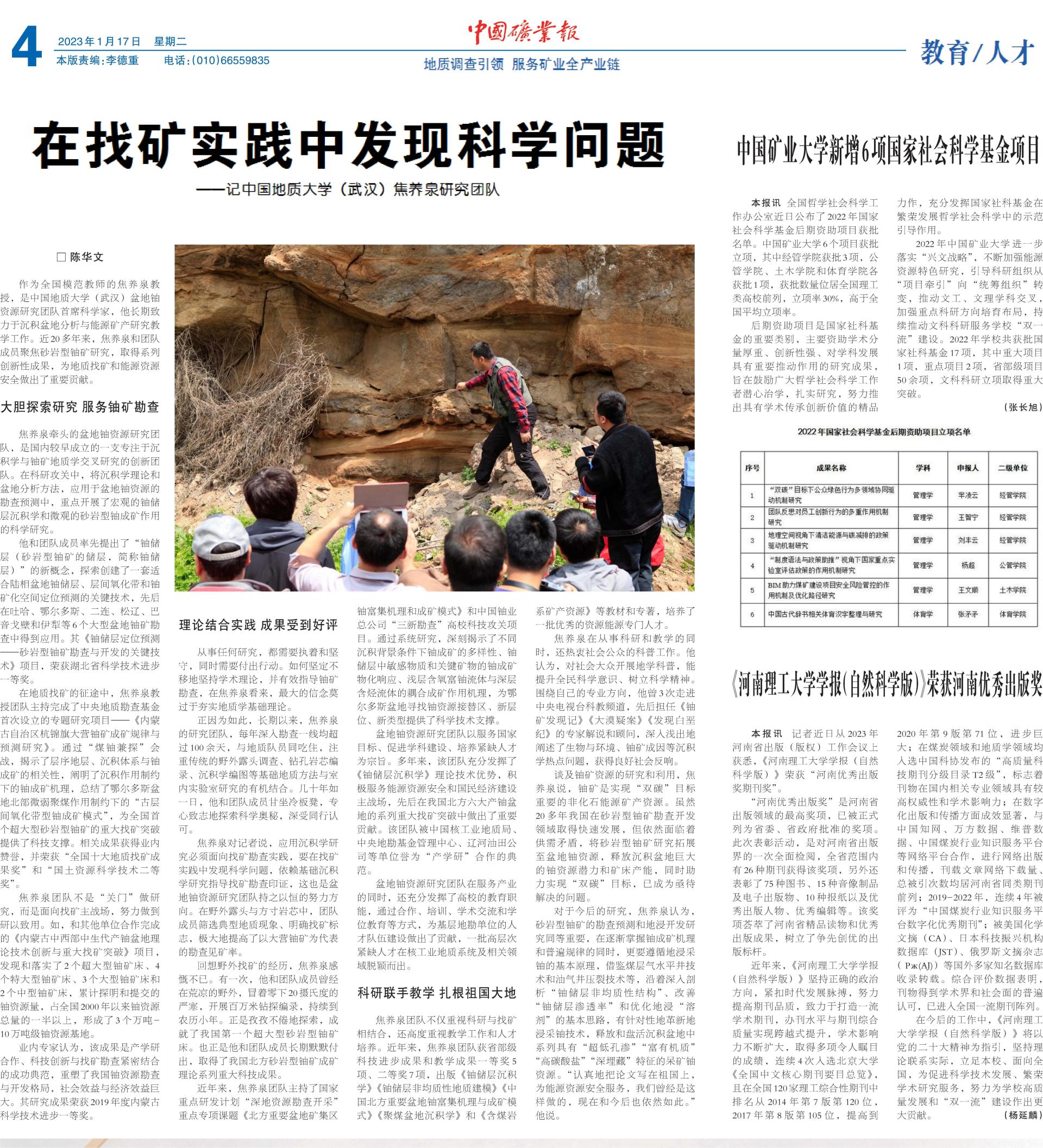 焦养泉团队不仅重视科研与找矿相结合,还高度重视教学工作和人才培养。近年来,焦养泉团队获省部级科技进步成果和教学成果一等奖5项、二等奖7项,出版《铀储层沉积学》《铀储层非均质性地质建模》《中国北方重要盆地铀富集机理与成矿模式》《聚煤盆地沉积学》和《含煤岩系矿产资源》等教材和专著,培养了一批优秀的资源能源专门人才。